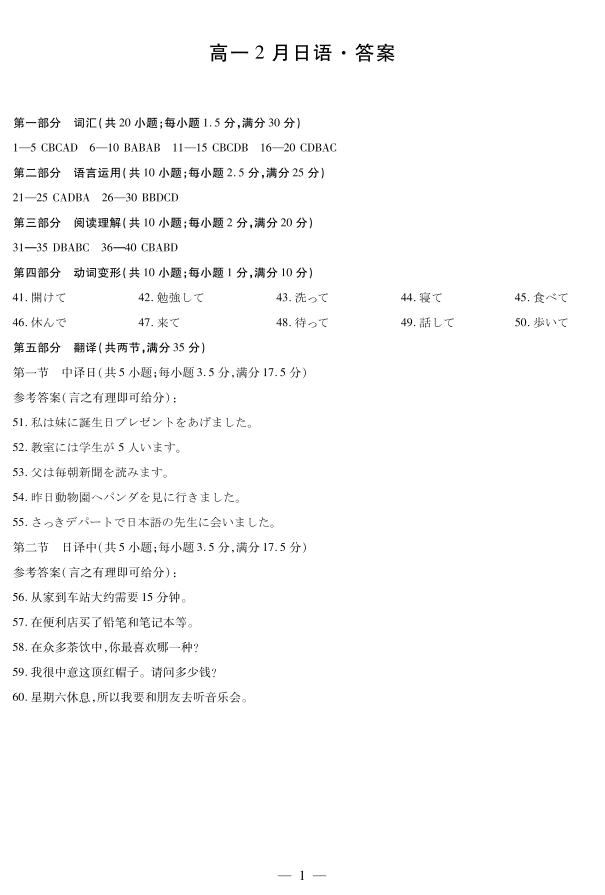 高一日语答案--安徽省合肥六中等学校2025-2026学年高一上学期2月期末考试