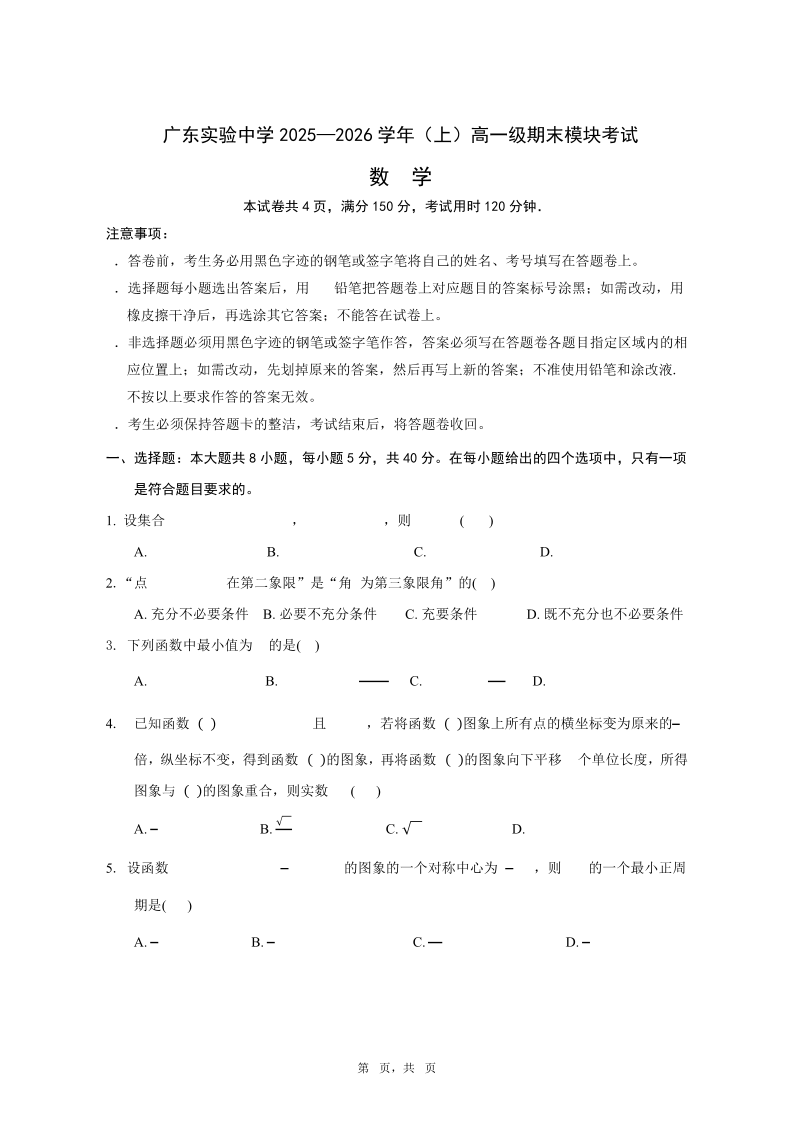 高一数学+答案--广东实验中学2025-2026学年高一上学期期末考试