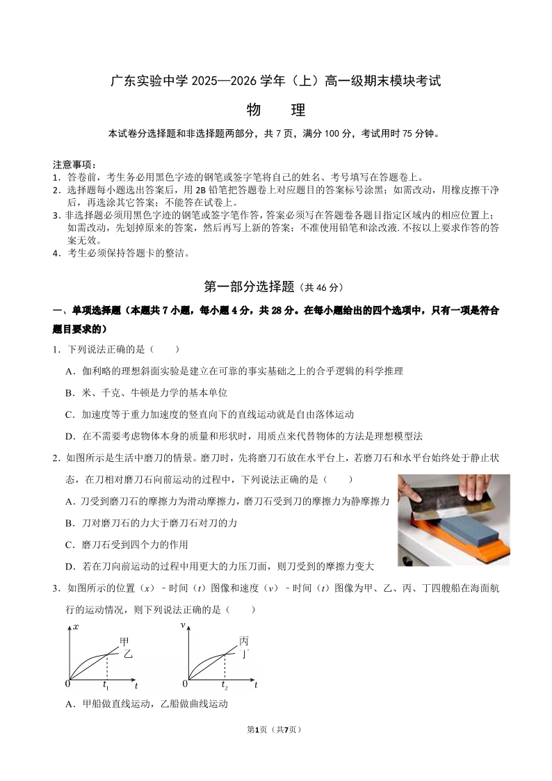 高一物理--广东实验中学2025-2026学年高一上学期期末考试