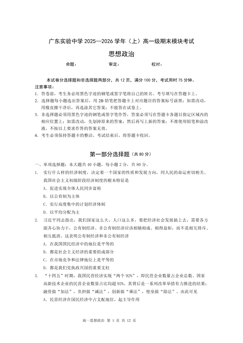 高一政治--广东实验中学2025-2026学年高一上学期期末考试