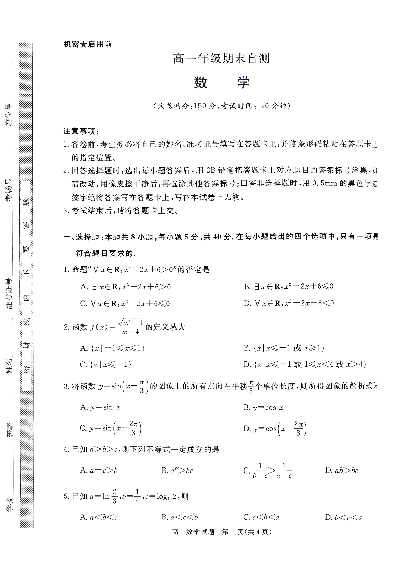 高一数学+答案--山西省晋城市2025-2026学年高一上学期2月期末自测