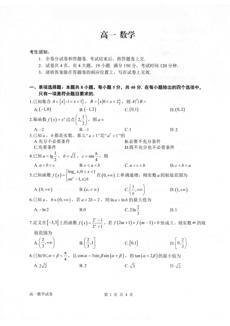 高一数学--浙江衢州市2025-2026学年高一上学期2月期末