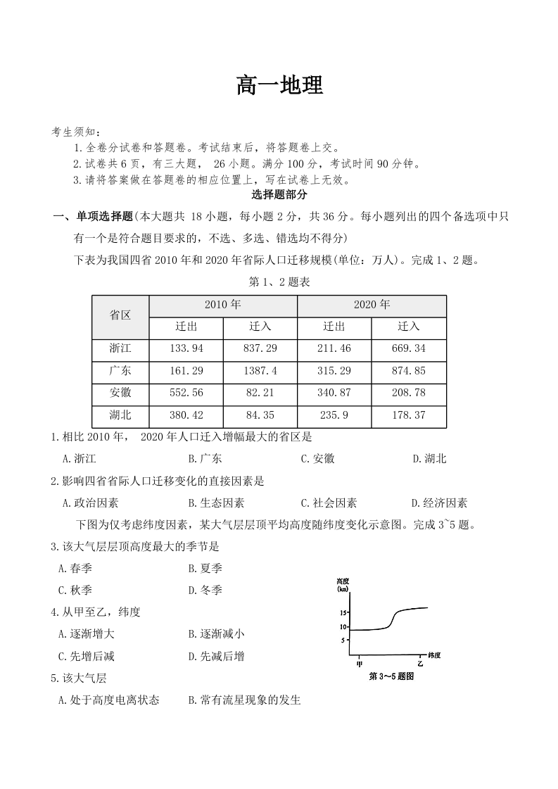 高一地理--浙江衢州市2025-2026学年高一上学期2月期末
