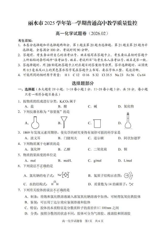 高一化学+答案--浙江省丽水市2025-2026学年上学期高一期末教学质量监控