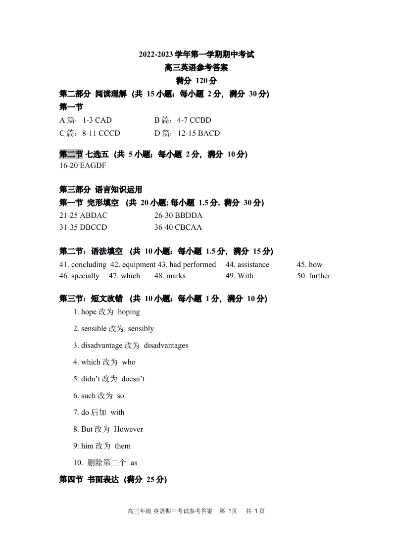 高三英语答案--甘肃省兰州第一中学高三上学期期中考试