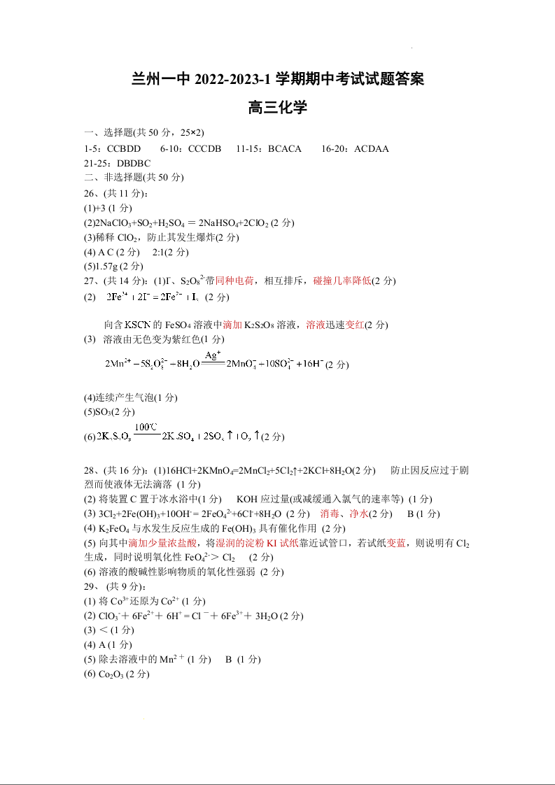 高三化学答案--甘肃省兰州第一中学高三上学期期中考试
