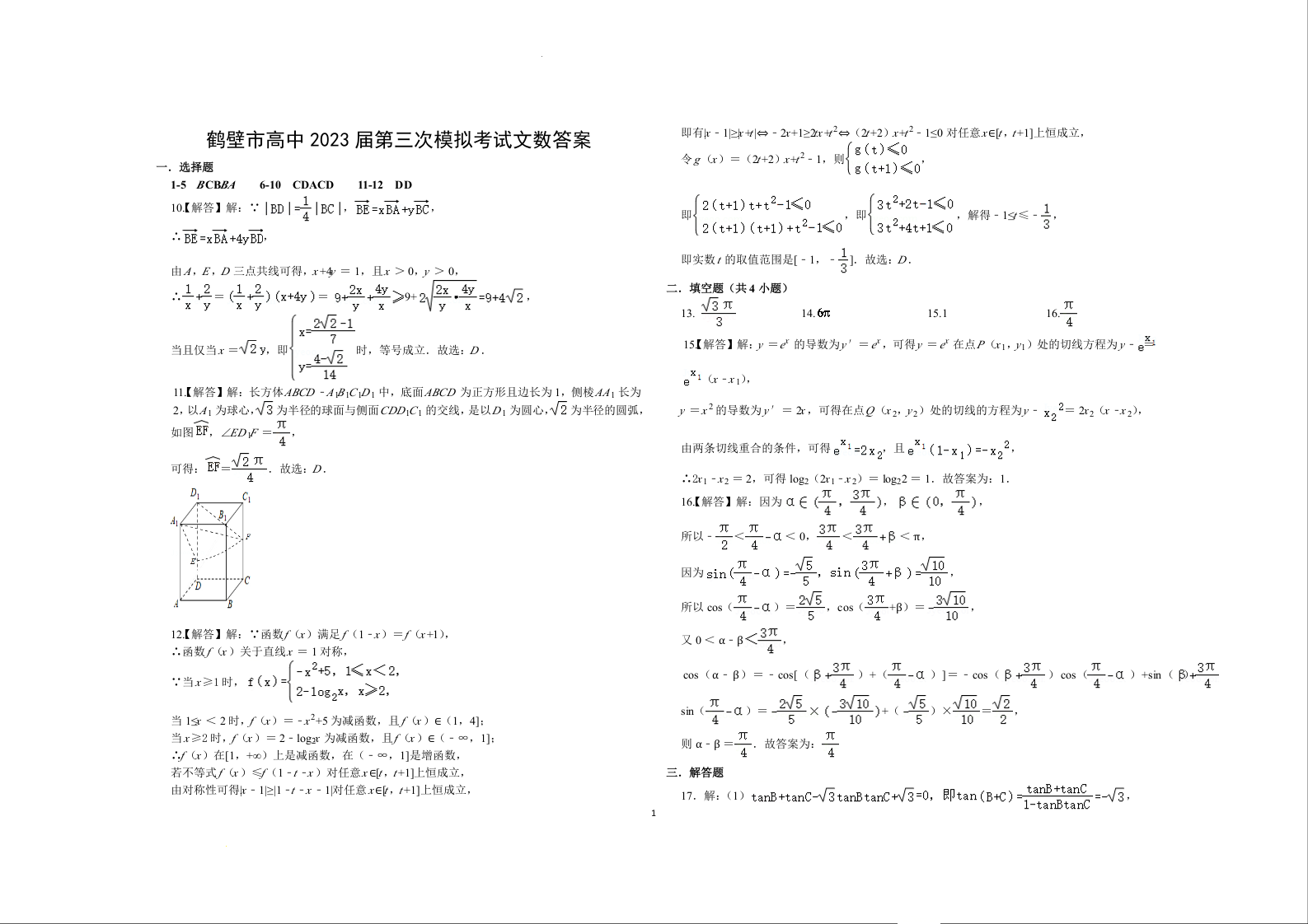 高三文数答案--河南省鹤壁市高中高三上学期第三次模拟考试