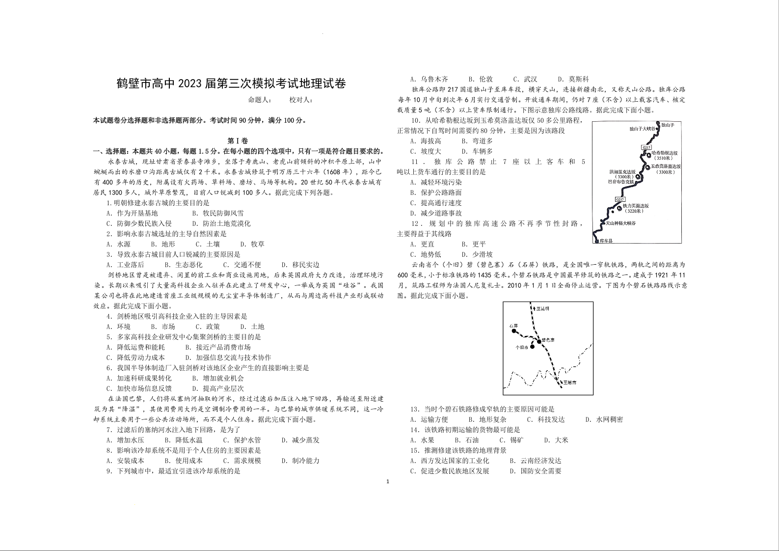 高三地理--河南省鹤壁市高中高三上学期第三次模拟考试