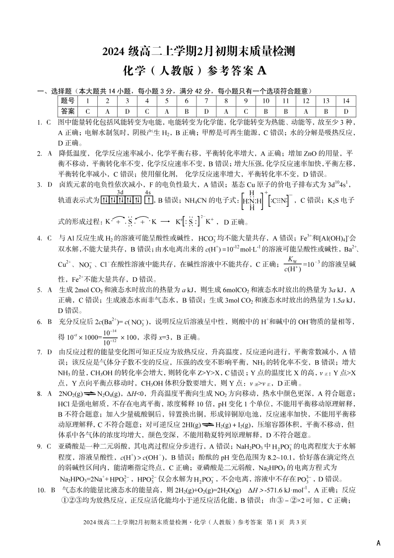 高二化学A答案--安徽省A10联盟2025-2026学年高二上学期2月初期末质量检测