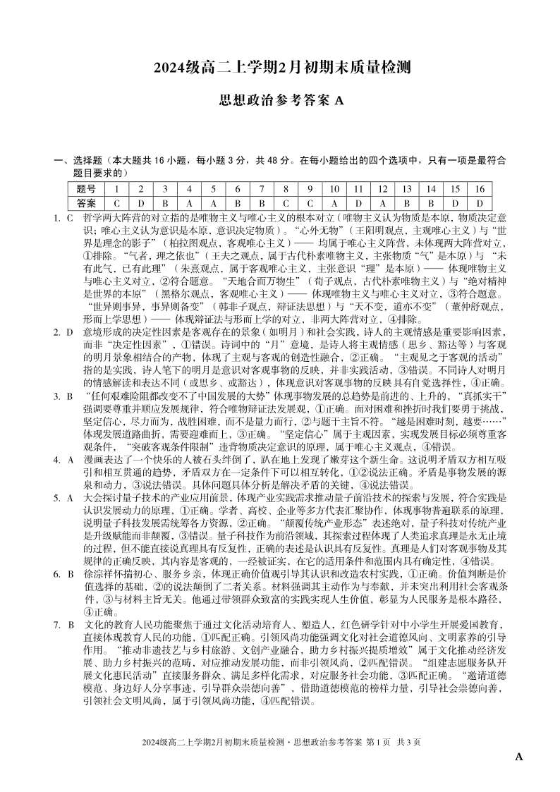 高二政治A答案--安徽省A10联盟2025-2026学年高二上学期2月初期末质量检测