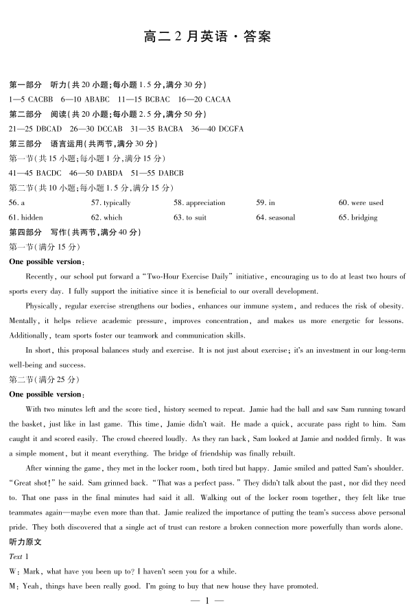 高二英语答案--安徽省合肥六中等学校2025-2026学年高二上学期2月期末考试