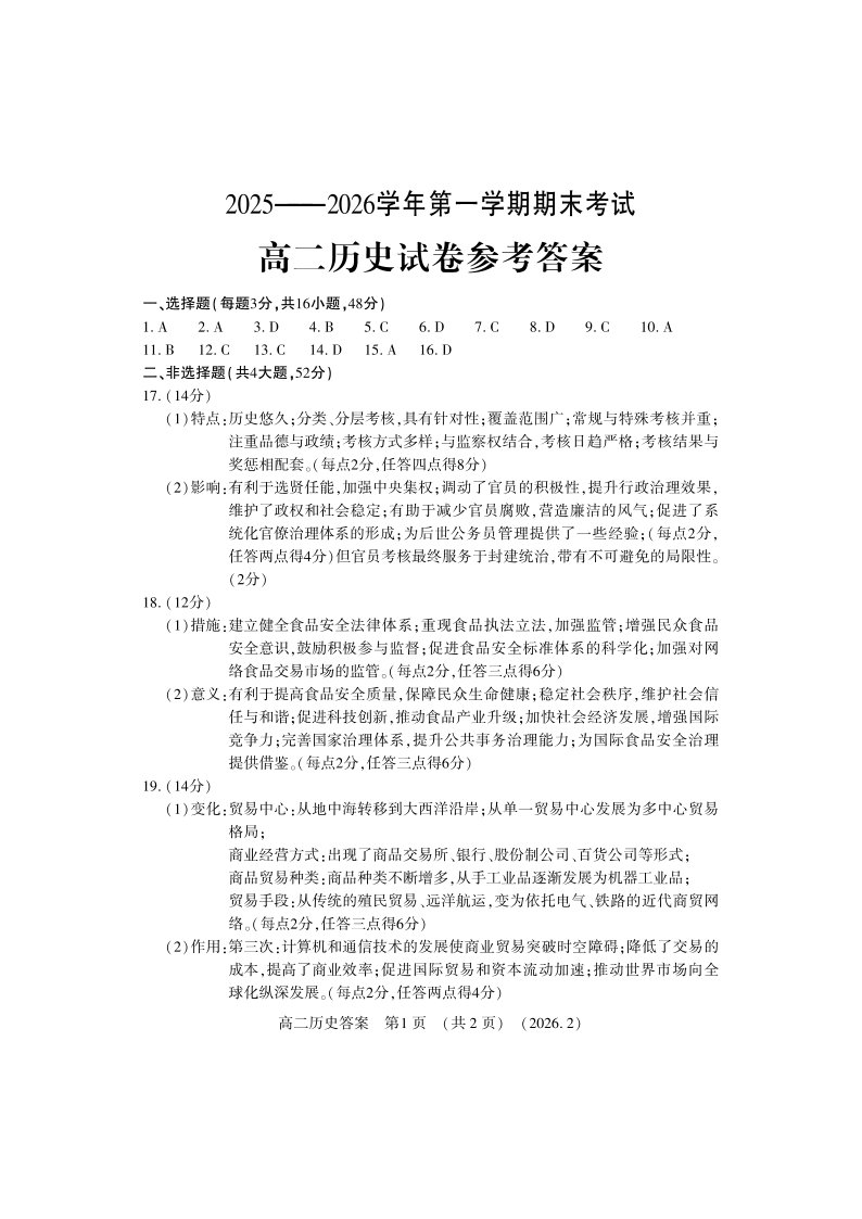 高二历史答案--河南省洛阳市2025-2026学年高二上学期2月期末考试