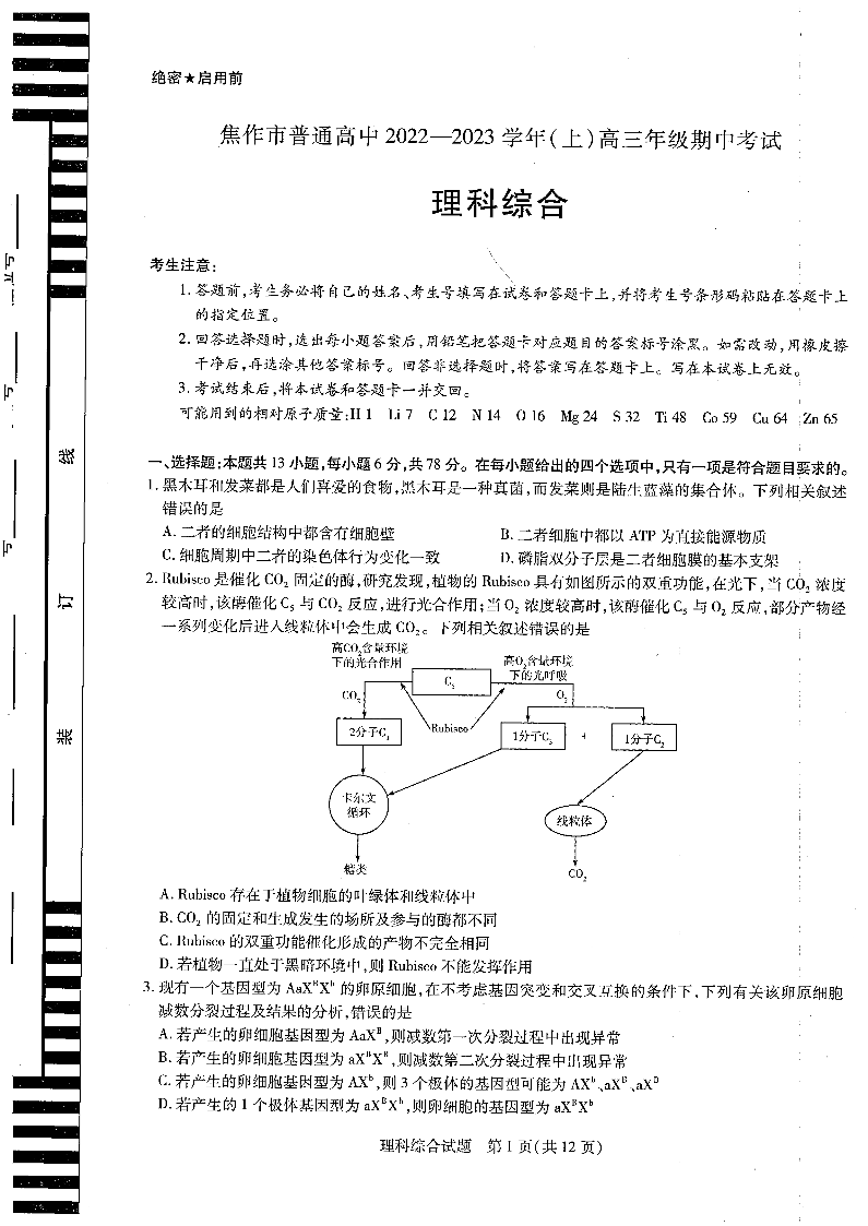 高三理综--河南省焦作市普通高中2022-2023学年高三上学期期中考试