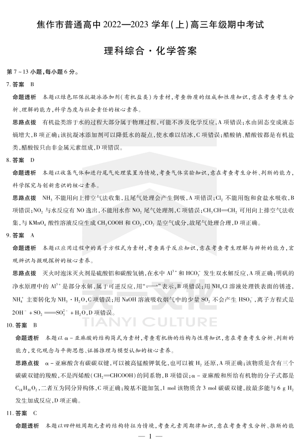 高三化学答案--河南省焦作市普通高中2022-2023学年高三上学期期中考试
