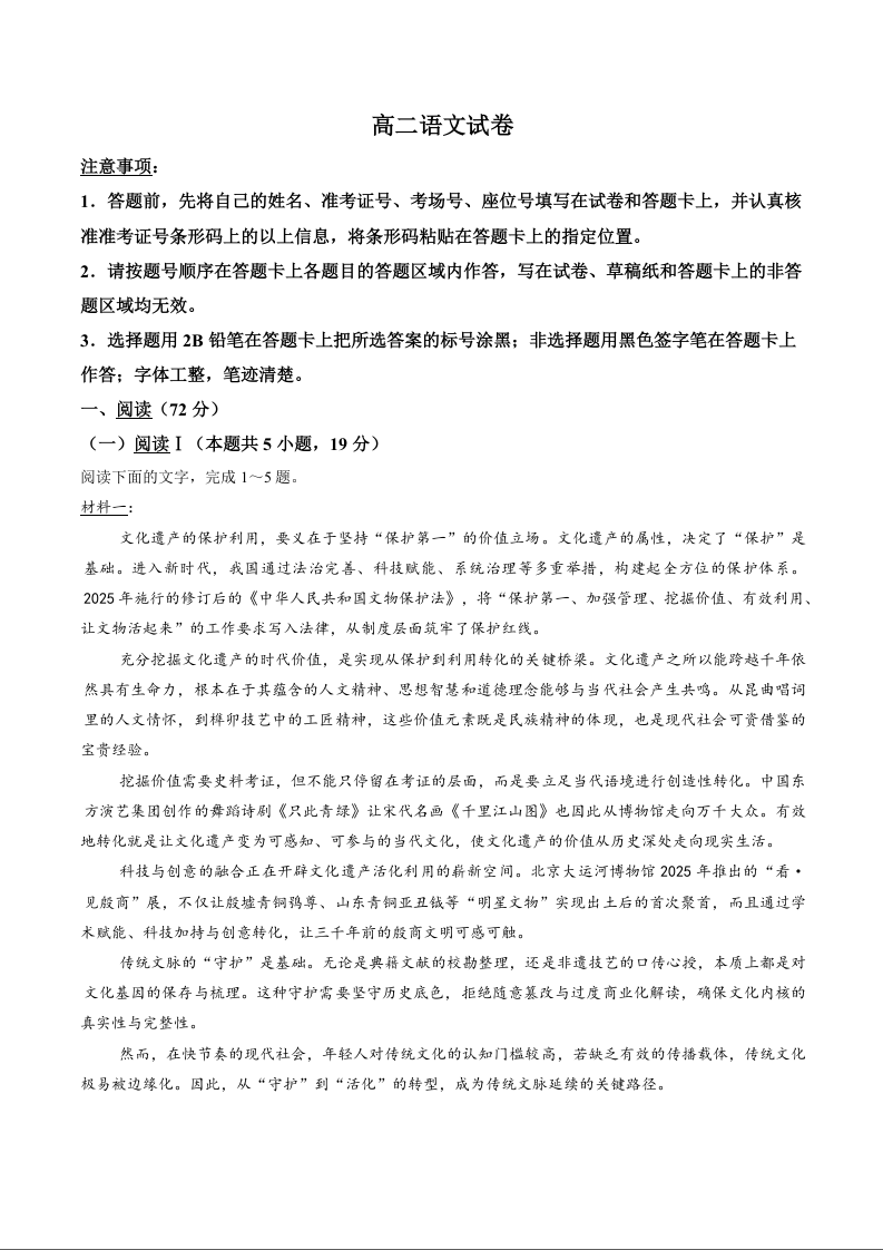 高二语文+答案--湖北省黄石市2025-2026学年高二上学期2月期末考试