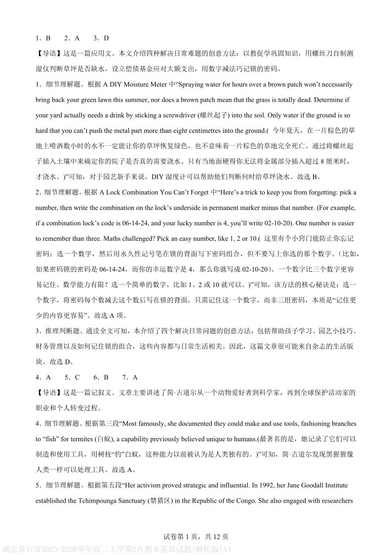 高二英语(解析版)--湖北省黄石市2025-2026学年高二上学期2月期末考试