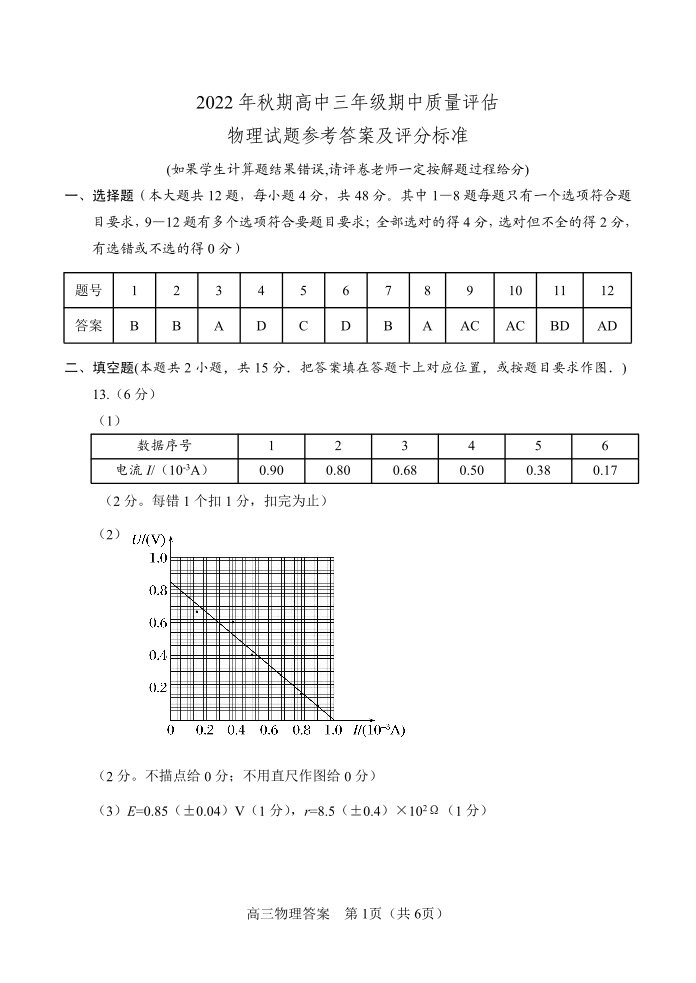 高三物理答案--河南省南阳市2022-2023学年高三上学期11月期中