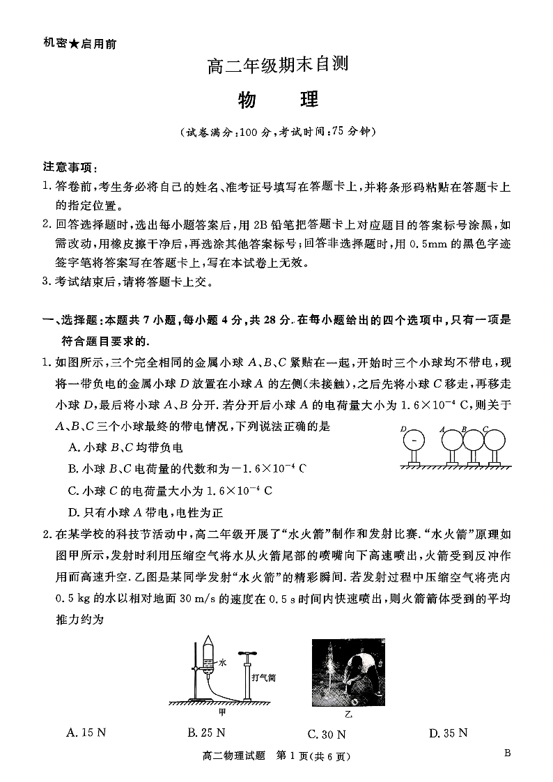 高二物理+答案--山西省晋城市2025-2026学年高二上学期2月期末自测