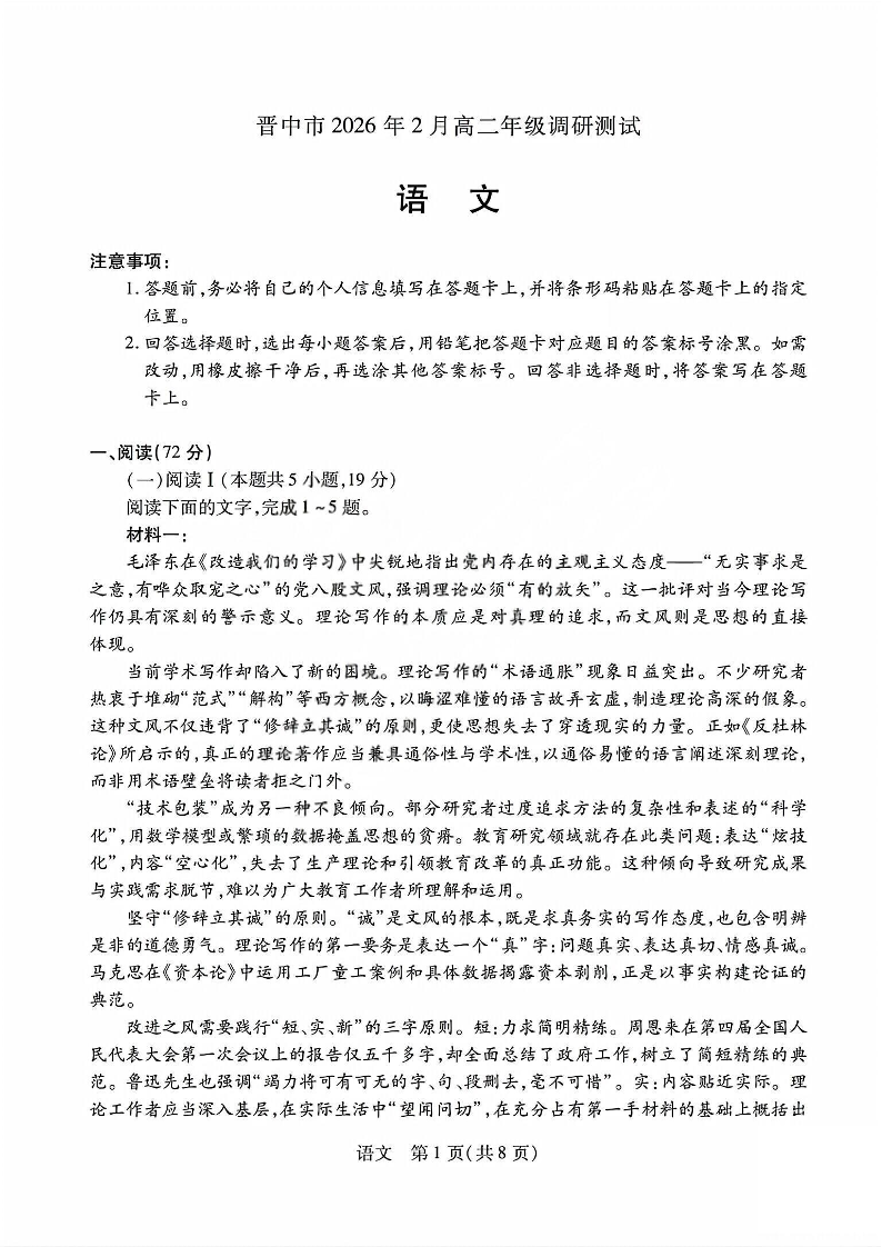 高二语文--西省晋中市2026年2月高二年级调研测试