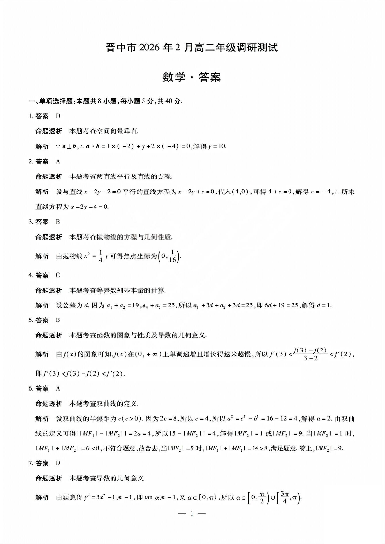 高二数学答案--西省晋中市2026年2月高二年级调研测试