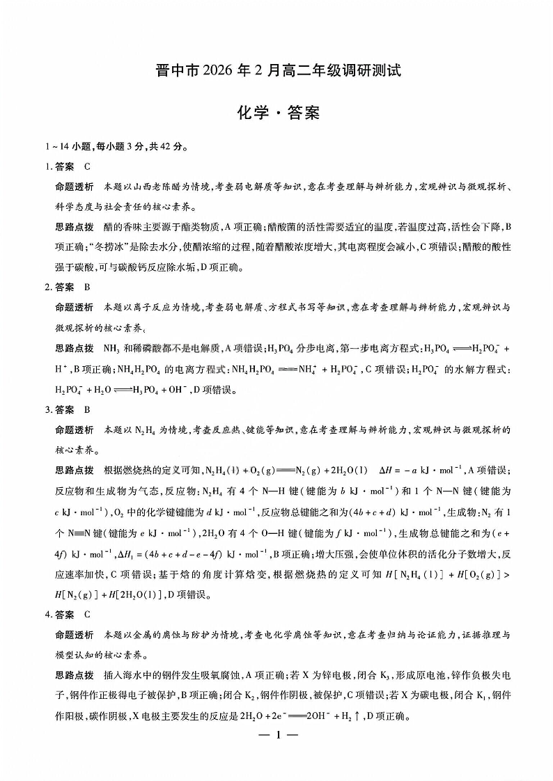 高二化学答案--西省晋中市2026年2月高二年级调研测试