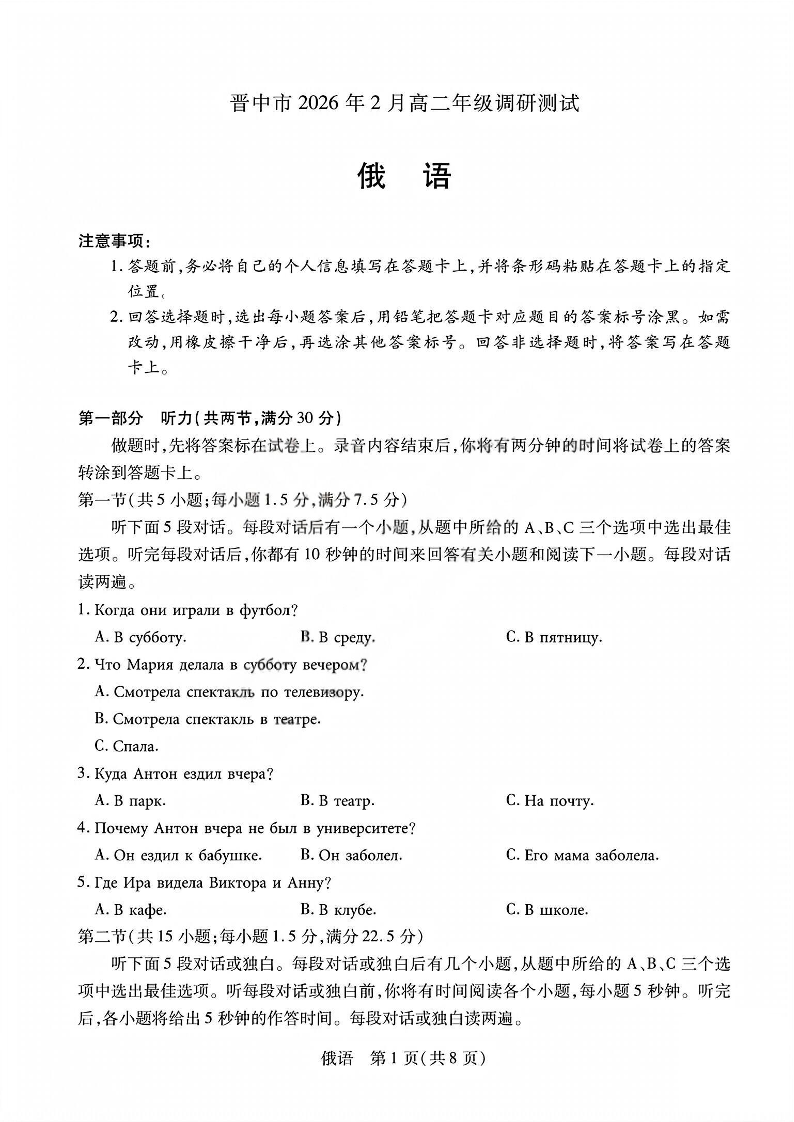 高二俄语--西省晋中市2026年2月高二年级调研测试