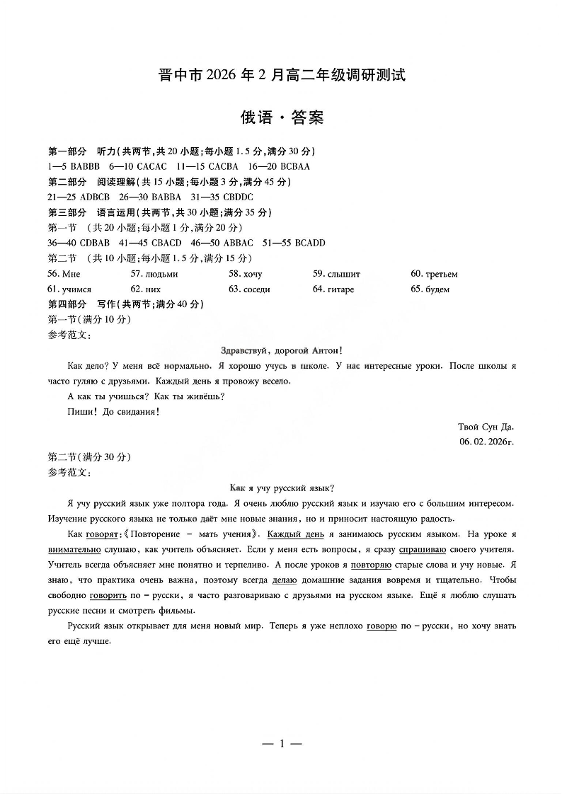 高二俄语答案--西省晋中市2026年2月高二年级调研测试