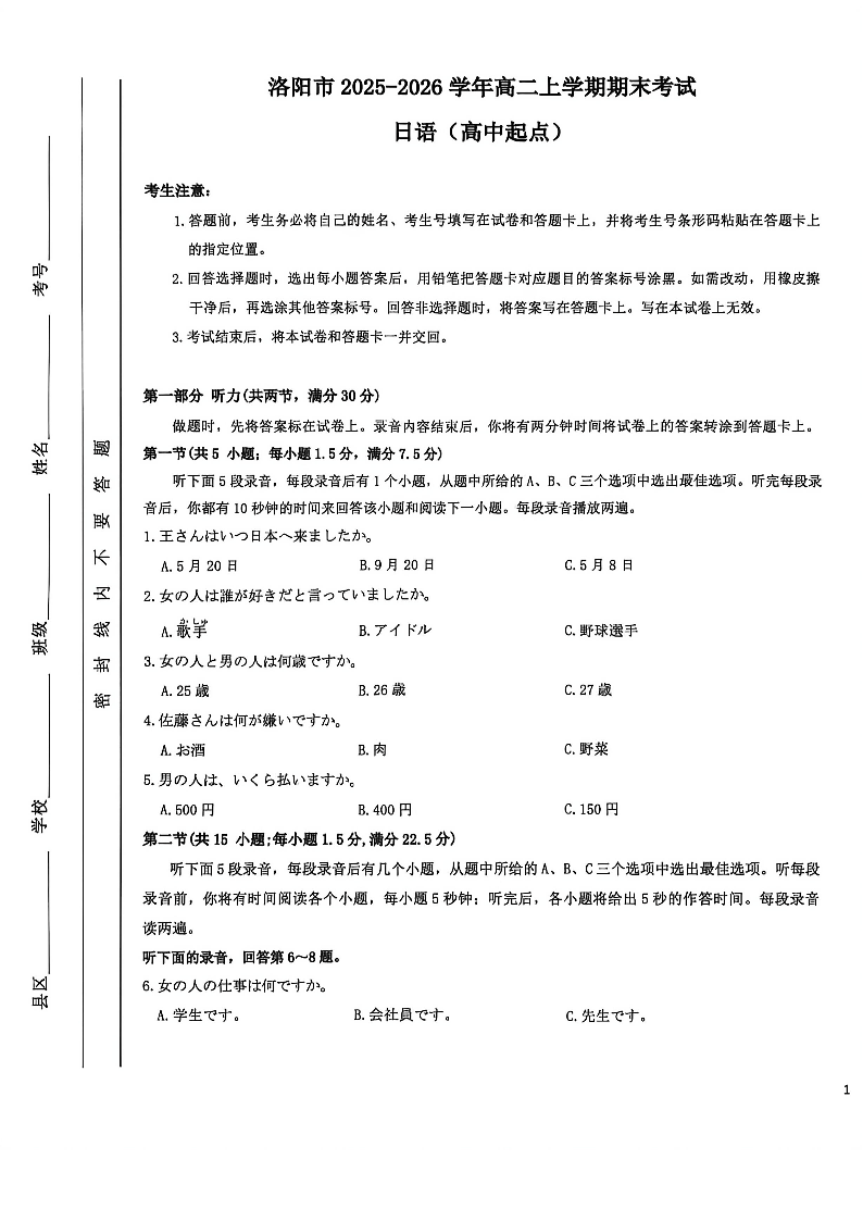 高二日语--河南省洛阳市2025-2026学年高二上学期2月期末考试