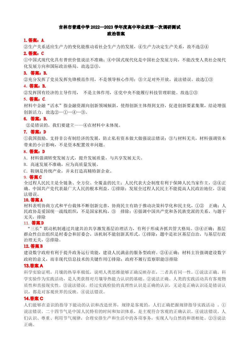 高三政治答案--吉林省吉林市2022-2023学年高三上学期第一次调研测试
