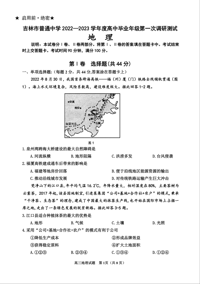 高三地理--吉林省吉林市2022-2023学年高三上学期第一次调研测试
