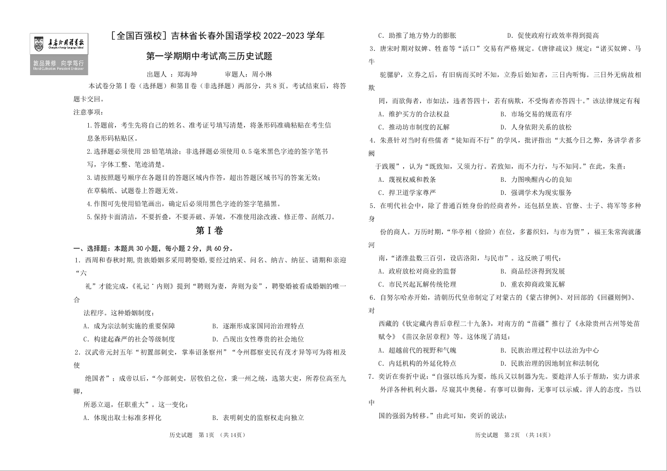 高三历史+答案--吉林省长春外国语学校高三上学期期中考试