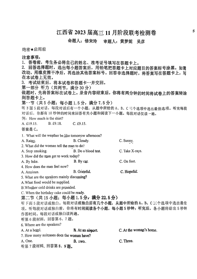 高三英语--江西省临川第一中学高三上学期11月教学质量检测