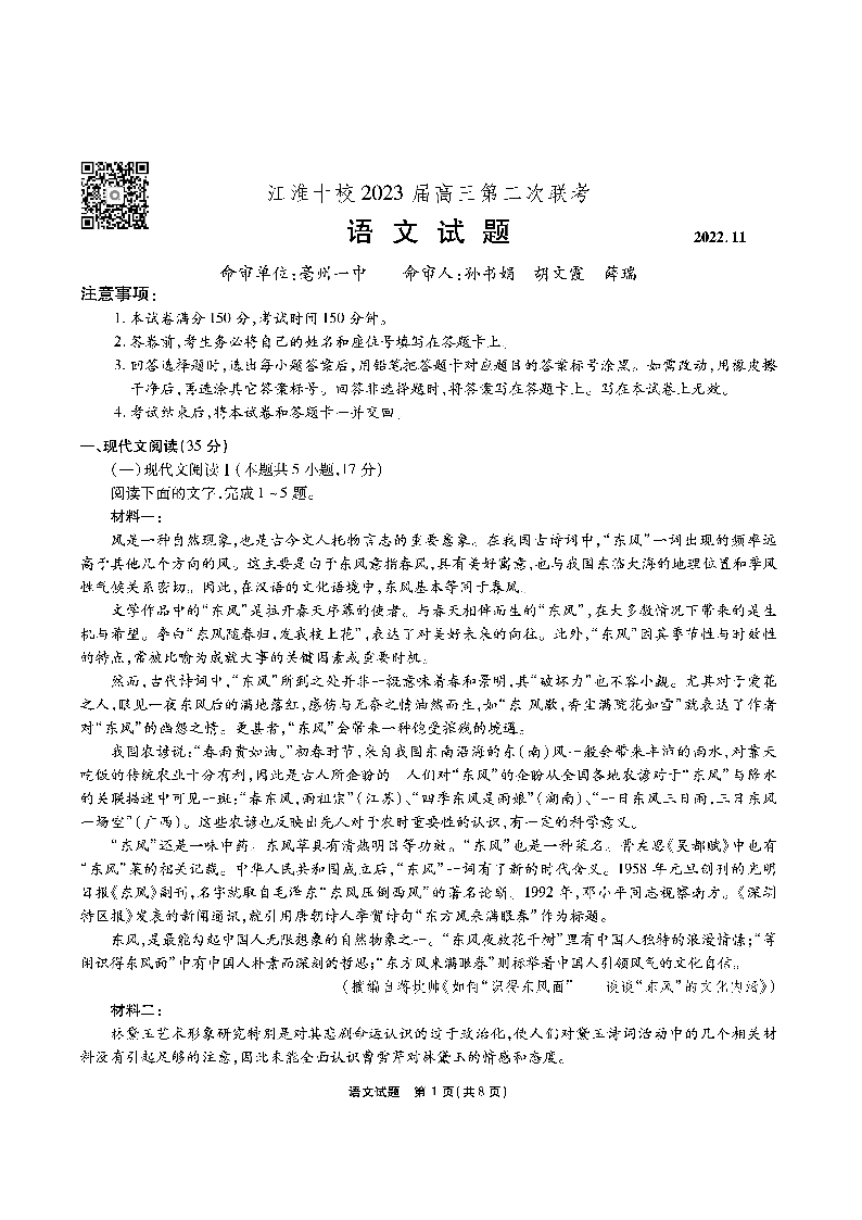 高三语文--江淮十校2023届高三第二次联考