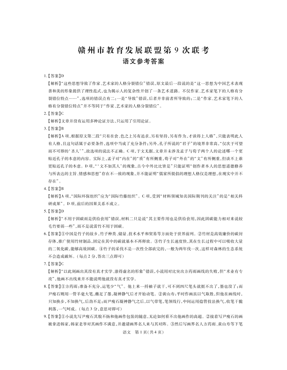 高三语文答案--江西省赣州市教育发展联盟2023高三上学期第9次联考