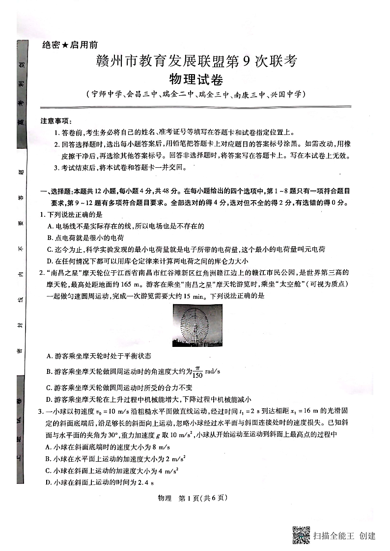 高三物理--江西省赣州市教育发展联盟2023高三上学期第9次联考