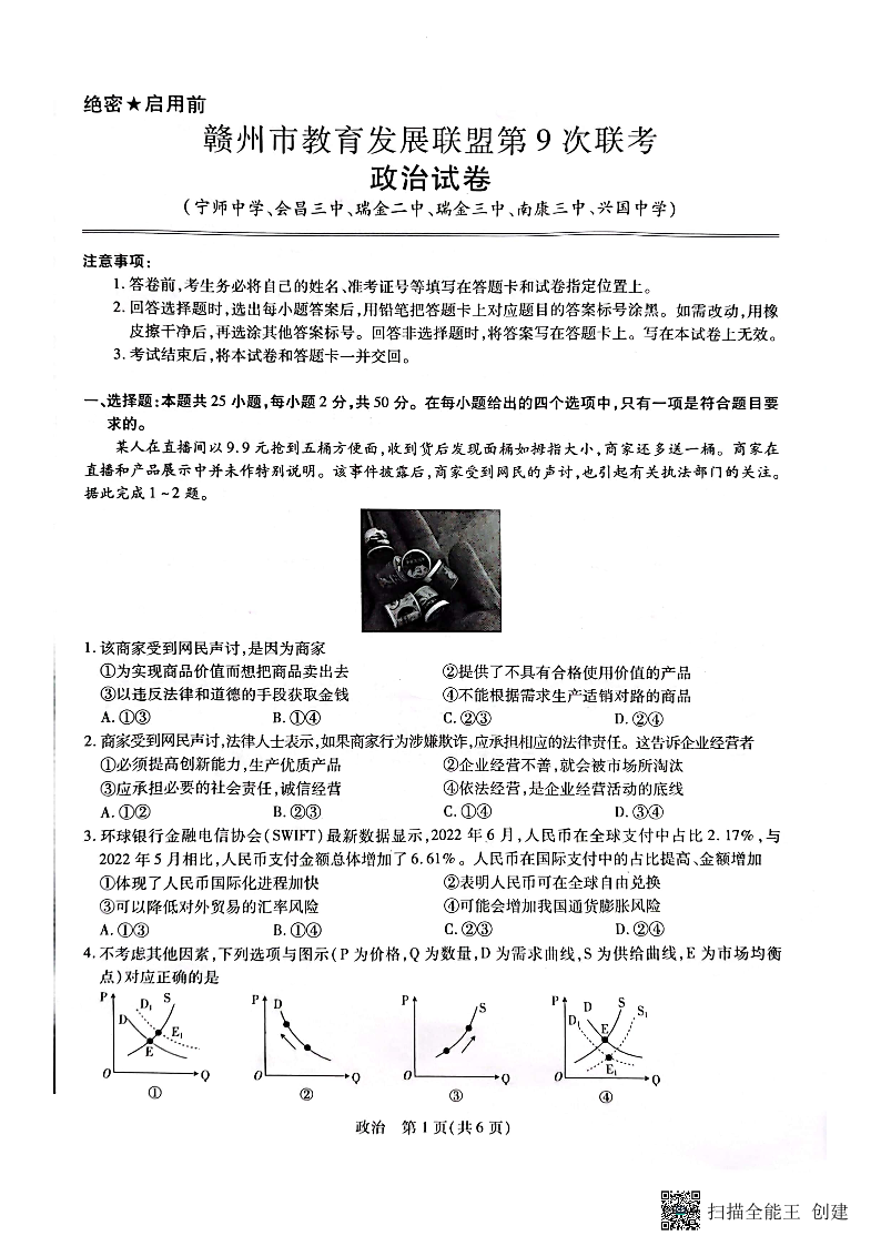 高三政治--江西省赣州市教育发展联盟2023高三上学期第9次联考
