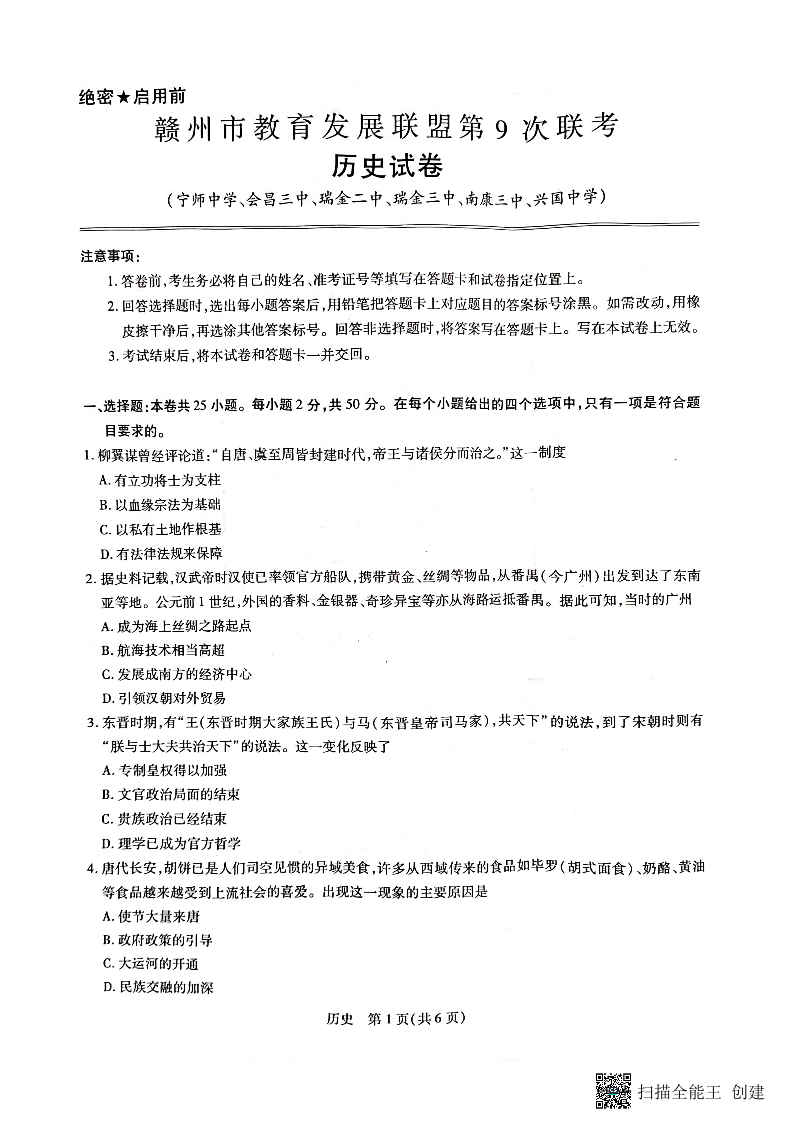 高三历史--江西省赣州市教育发展联盟2023高三上学期第9次联考