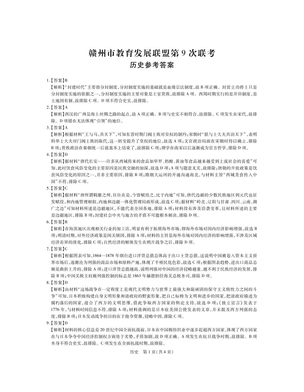 高三历史答案--江西省赣州市教育发展联盟2023高三上学期第9次联考