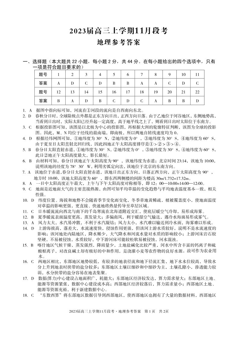 高三地理答案--江西省A10联盟高三上学期11月段考