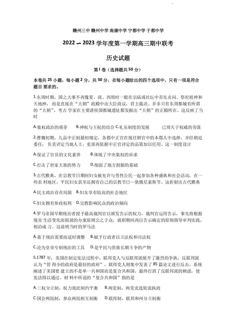 高三历史--江西省赣州市五校2023届高三上学期期中联考