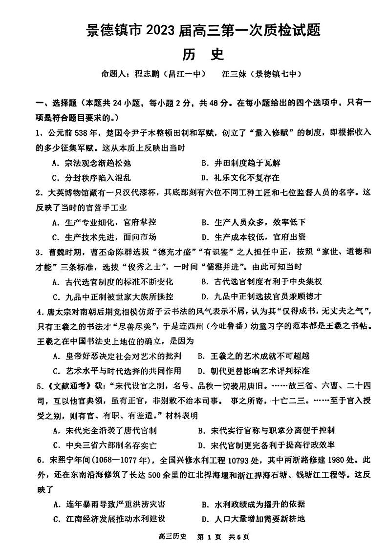 高三历史+答案--江西省景德镇市2023届高三一模