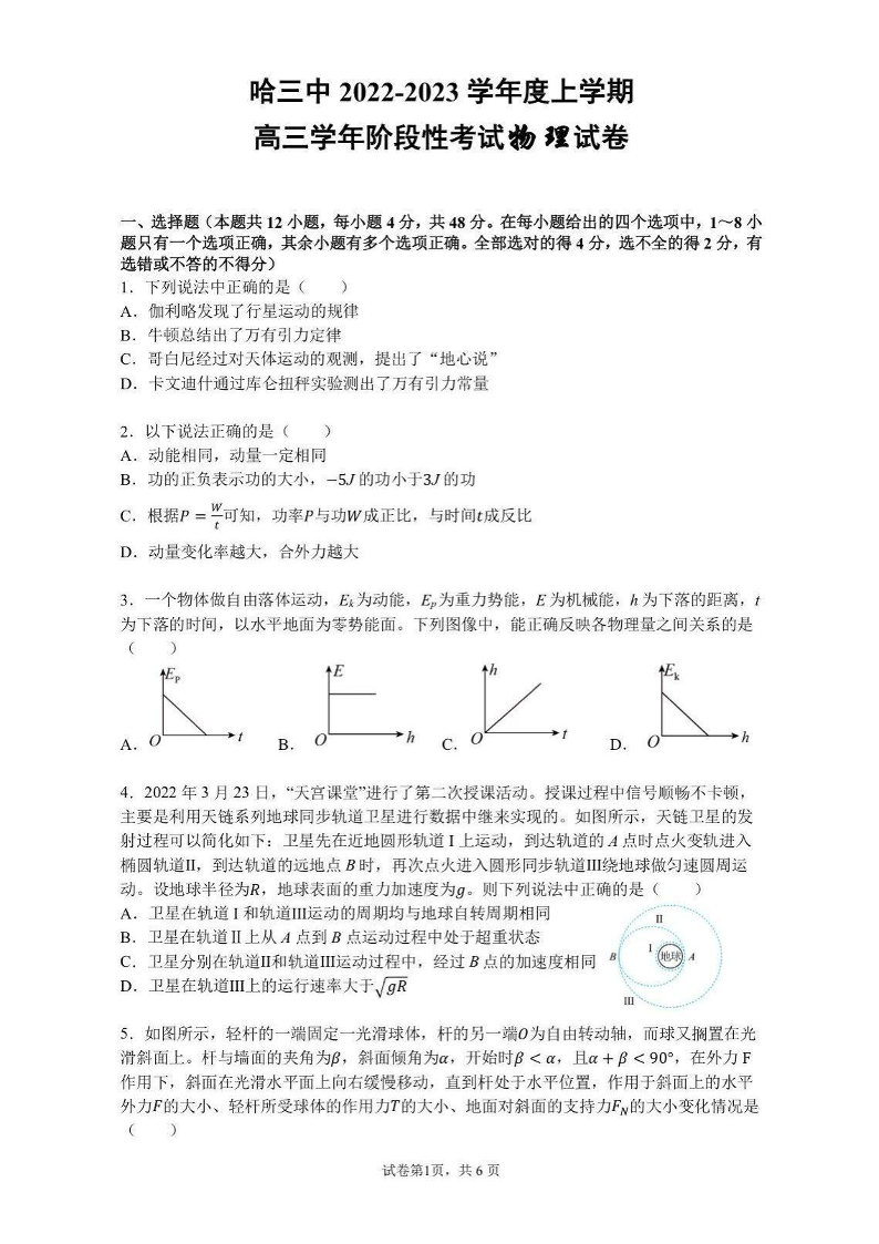 高三物理--黑龙江省哈尔滨市第三中学校2023高三上学期期中考试