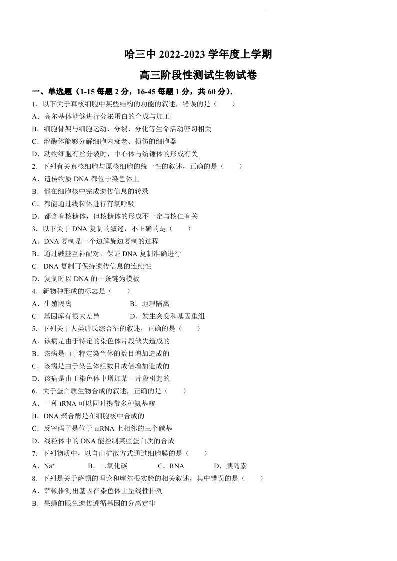 高三生物+答案--黑龙江省哈尔滨市第三中学校2023高三上学期期中考试