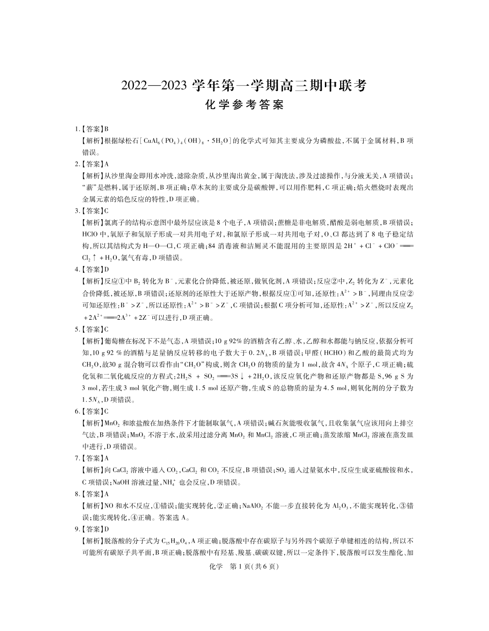 高三化学答案--江西省稳派教育高三上学期11月期中
