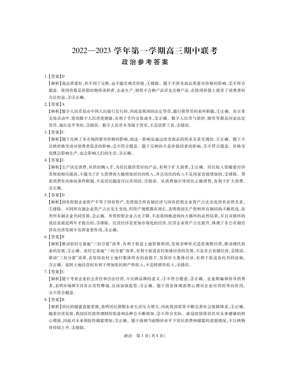 高三政治答案--江西省稳派教育高三上学期11月期中