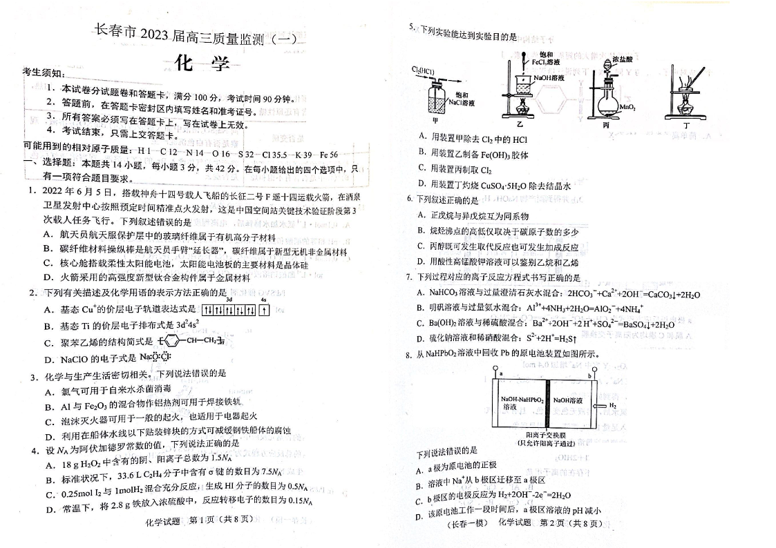 高三化学--长春市2023届高三质量检测(一)