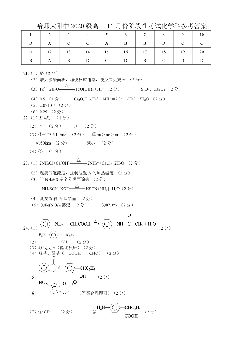 高三化学答案--黑龙江省哈尔滨师范大学附属中学2023高三上学期11月阶段性考试考试