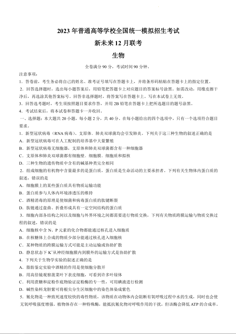 高三生物+答案--河南省新未来联盟2023高三上学期12月联考