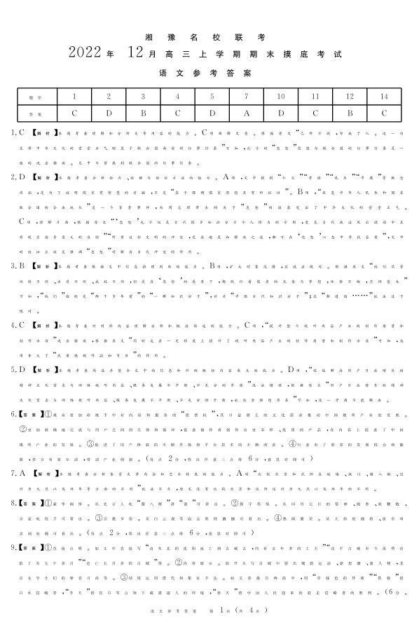 高三语文答案--河南省湘豫名校联考2023高三上学期12月期末摸底考试