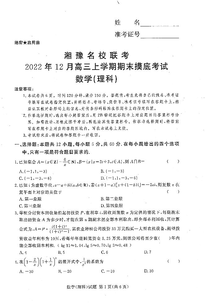 高三理数--河南省湘豫名校联考2023高三上学期12月期末摸底考试
